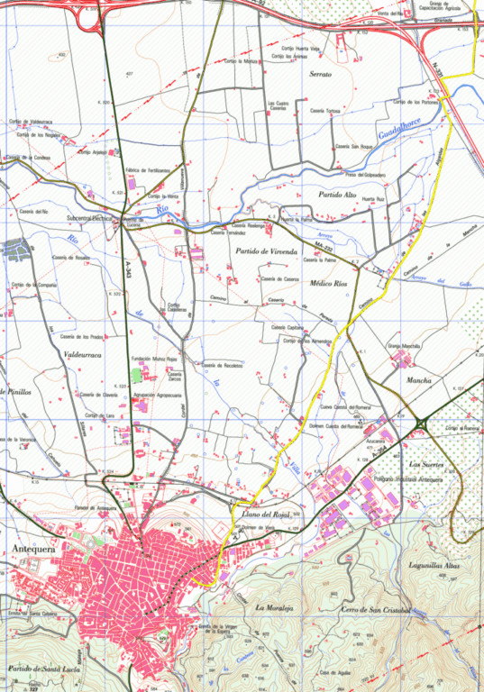 Dejamos el Cementerio a la Izquierda, el Dólmen a la derecha, y encontraremos las primeras flechas un poco antes de una rotonda. Después de pasar el puente sobre el ferrocarril, entramos en la Vega Antequerana por un camino llano que atraviesa la carretera Ma-232, y 2,5 Km. después cruza la Autovía por un paso inferior junto al río Guadalhorce que queda a nuestra derecha.
